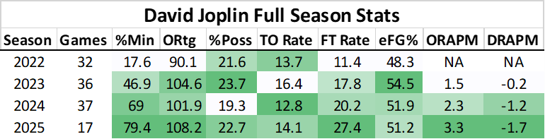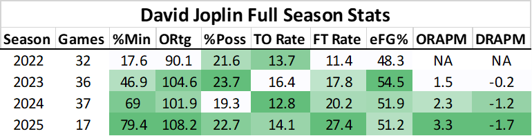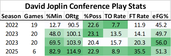 Since conference play started, Joplin has been playing 30+ minutes a game and putting up an ORtg of nearly 115.