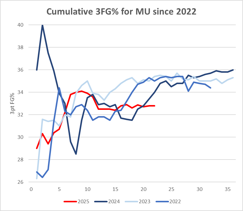 Furthermore, we have a decent sample to show that Marquette tends to improve its 3-point shooting as the season progresses. Check out the chart below.