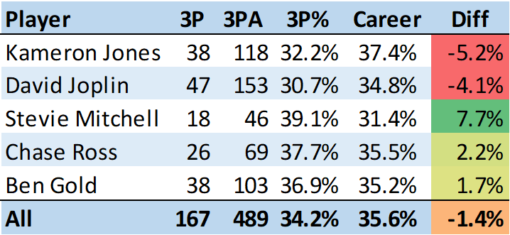 But the red is glaring. Kam and Jop are both 4%+ worse this season than they are for their career, which is made more problematic because they have taken the most 3s this season, 55% of those taken by he starters.