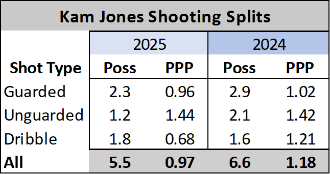 Obviously, in his role this year Kam doesn’t have the same setup he’s had the past 3 seasons. He can’t simply load up and prepare for a Kolek kickout. He’s shooting fewer 3s per game than any season since 2022, down from 6.5 last season to 5.4 this one.