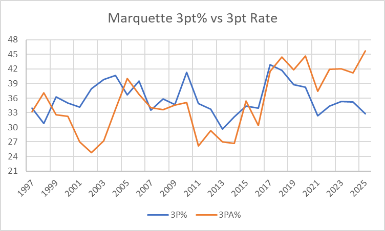 However, despite the process matching expectations, the results have thusfar not been as positive as expected. Marquette is shooting only 32.8% from 3-point range, the 2nd lowest hit rate for MU in the the last decade.