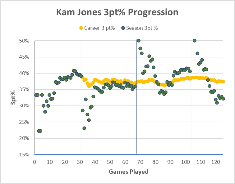 The reason we like to use career percentage as a benchmark is that 3-point shooting is extremely fickle, and a 20+ game sample isn’t always a great barometer of true skill. Using their 4 year samples, we can say with confidence, Kam and Jop are good to great 3-point shooters, even if the results haven’t been there so far in this year.