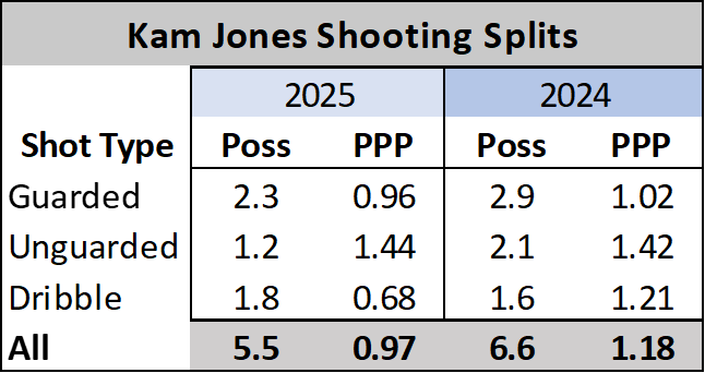 Obviously, in his role this year Kam doesn’t have the same setup he’s had the past 3 seasons. He can’t simply load up and prepare for a Kolek kickout. He’s shooting fewer 3s per game than any season since 2022, down from 6.5 last season to 5.4 this one.