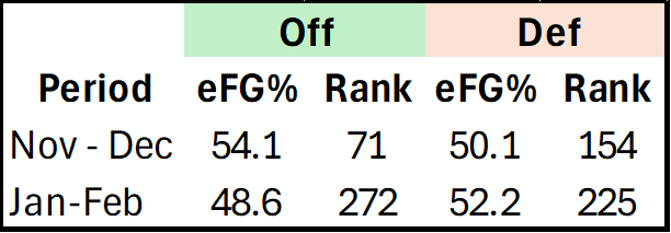 For the season, Marquette’s eFG% on offense is 51.8%, which is 134th in the country. However, if we only look since January 1st, that drops to 48.6%, 272nd. On defense, Marquette relies more on turnovers than being an elite shot defending team, but even here, Marquette is down to 225th in the calendar year.