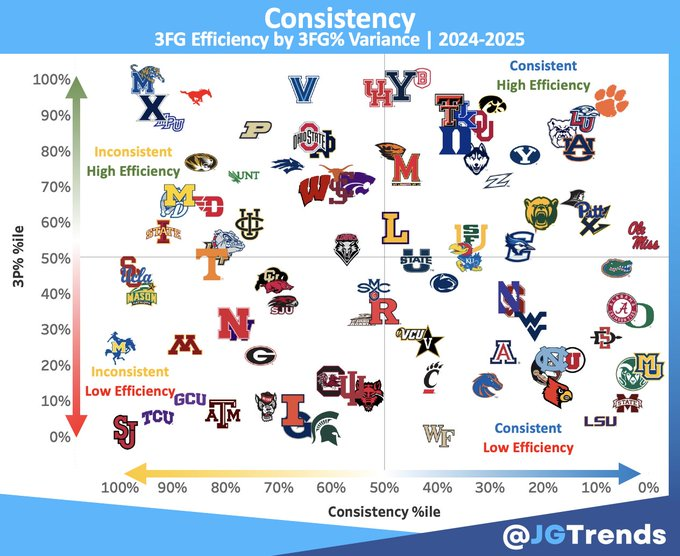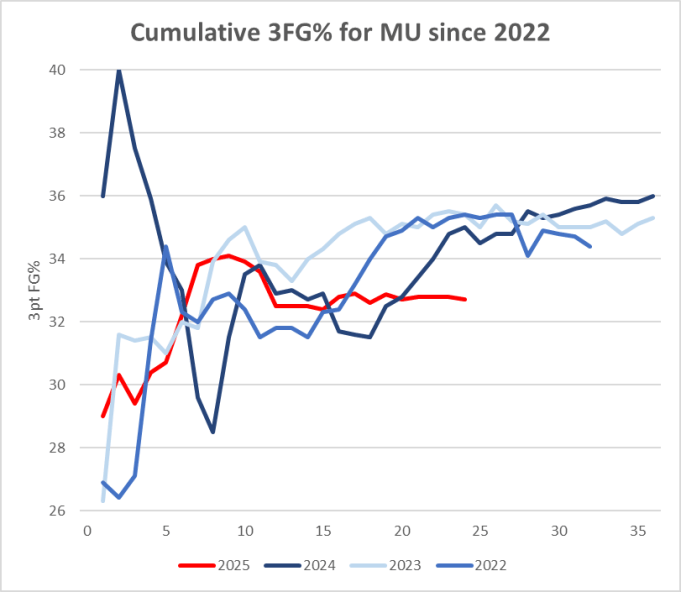 This chart makes it so clear to see just how far below the past 3 seasons Marquette’s distance accuracy currently is.