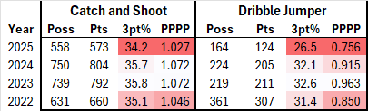 Yes, catch and shoots are below previous years as well, and .045 PPP is not insignificant when we’re talking about 700+ possessions over a season, but in an average game, that’s only about 1 point a game. The drop in dribble jumpers is particularly notable when you break down who is taking these difficult shots.