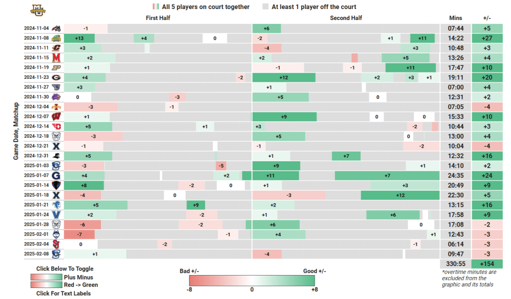 It’s risky to rely on Net Rating data over a small sample, as a few makes here or there makes a drastic difference, but that caveat aside, Parham and Lowery have combined for 196 possessions over the last 5 games, and Marquette is playing like a top-15 team in that time frame with one or both on, compared to a sub-140 team when neither of them are in.