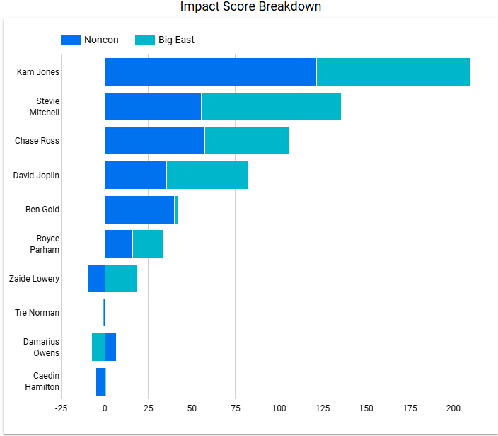 Here, we can visually see that Kam’s cumulative non-conference impact scores are higher than all but Stevie’s full season scores. That 121.5 was insane and why he was so deserving of the National Player of the Year Conversations he was on. Since Big East play began, he still leads Marquette with an impact score of 88.4, but that average of 6.3 per game is well below his noncon average of 11.1.