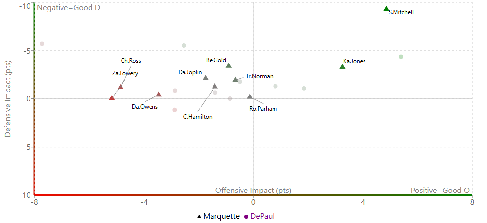 Take Marquette’s game against DePaul, it felt like an underwhelming result against a weak opponent with only a few standouts from Marquette. And using that player impact formula, you can see that’s exactly what took place.