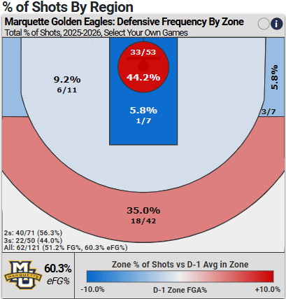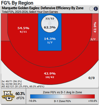 Together, opponents are shooting 62.3% at the rim against Marquette, which isn’t great, but pretty much middle of the pack, per CBB Analytics.