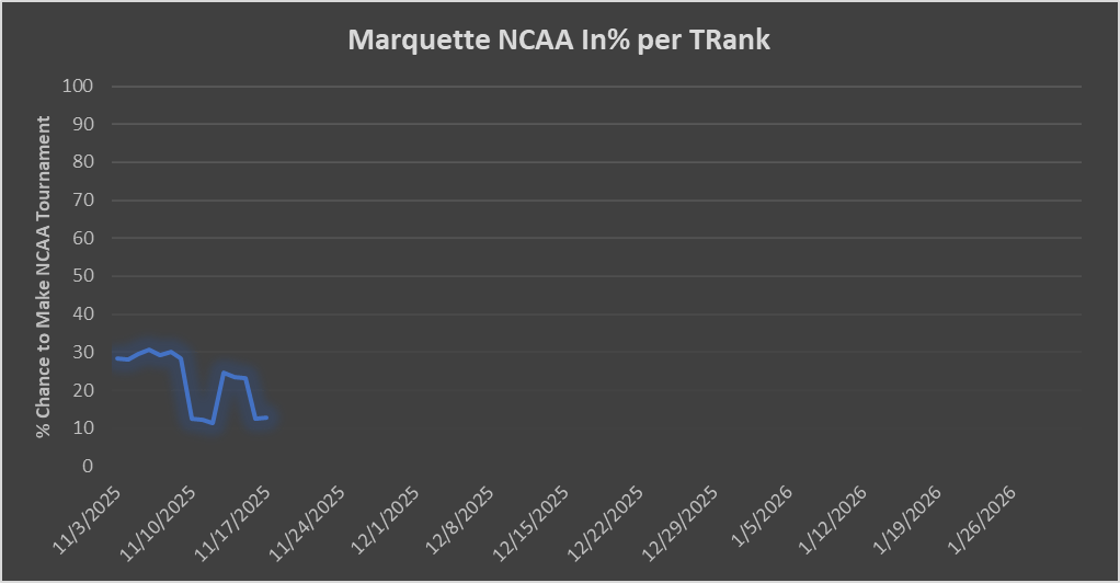 No, but it’s important to be honest with the facts. And currently, Marquette has about a 13% chance to make the NCAA tournament, per Bart Torvik’s site, down from about 28% when the season began. (His model runs 10,000 simulations based on that morning’s data, and gives us those results for probability).