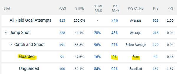 One of the biggest reasons why is it can’t make contested jumpers. It is literally the worst team in the country, per Synergy, at making contested spot-up jumpers, ranking 365th out of 365 teams scoring .46 PPP.