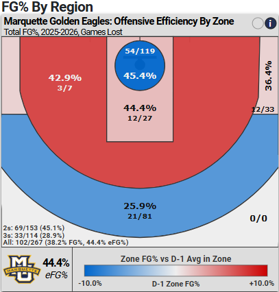 Using the CBB Analytics database, Marquette is shooting 45.4% at the rim in its 4 losses this season, which is 17.2% below the D1 average at the rim.