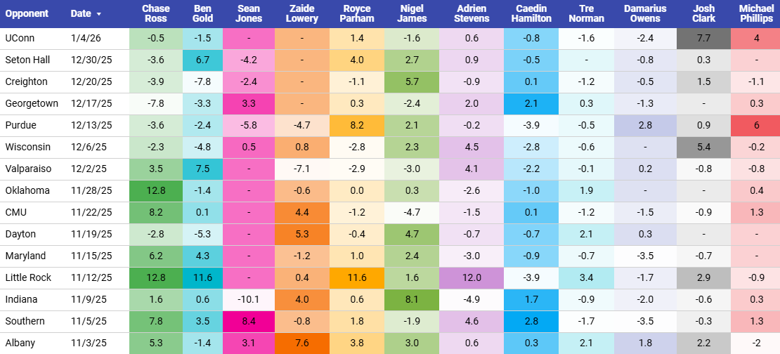 After a blazing start to the season, Chase Ross has posted 6 straight negative impact games. For context, Kam Jones’ lowest impact grade last season was a +1.0. This isn’t meant to say this is all Chase’s fault, simply noting that as the noncompetitive losses mount, having your stalwart in a funk will make it look so much worse.