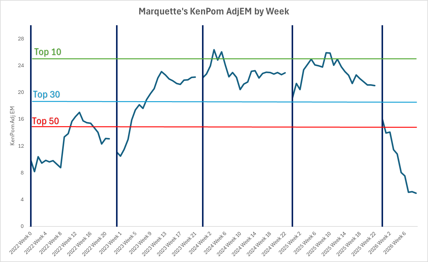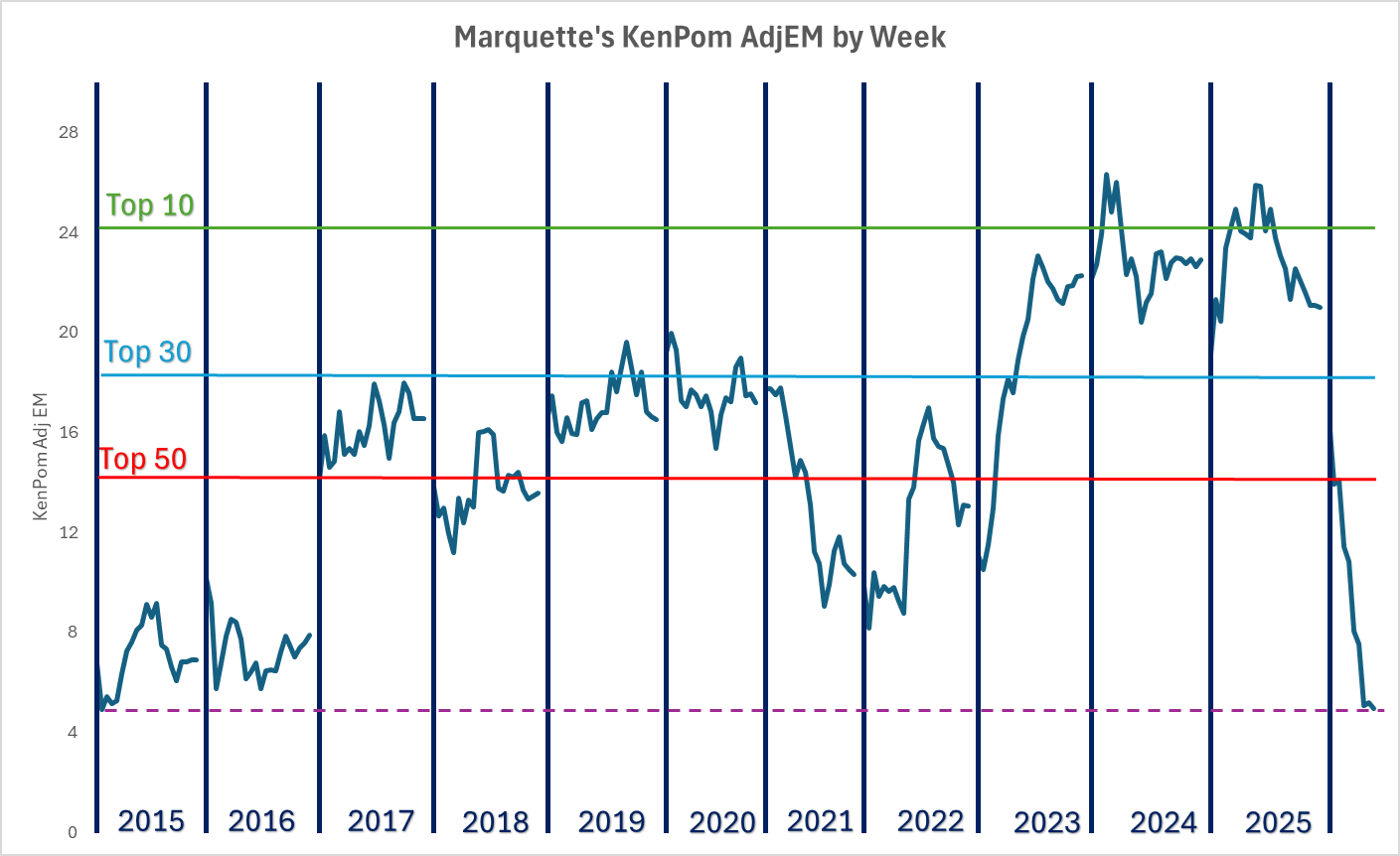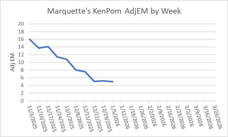 As of 1/5/26, this is currently the 2nd lowest point in recent Marquette history, only trailing the first week of the 2015 season, when it lost to Belmont, went to OT with IUPUI and was shellacked at home by Iowa. That low point was 4.91, and this team is sitting at 4.94. A loss to Xavier this week will put a new “leader” on the board.