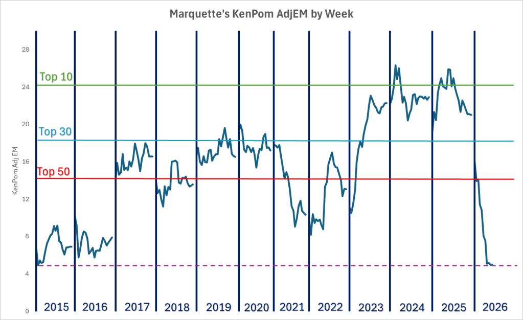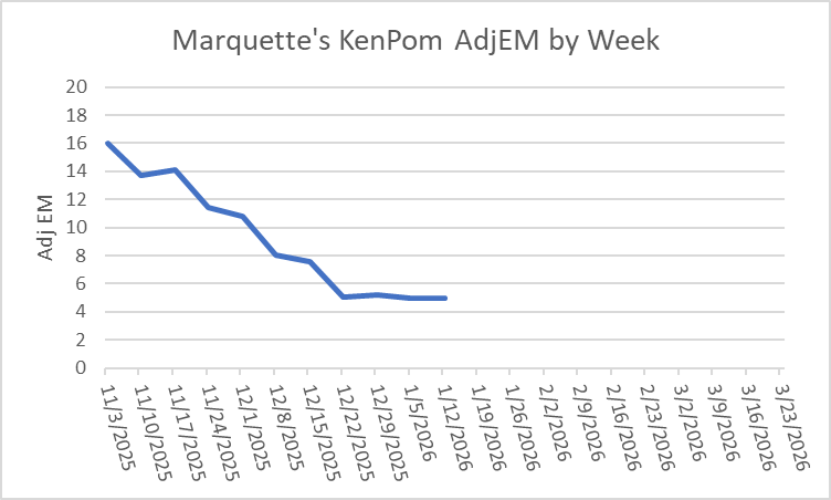 As of 1/12/26, this is currently the 3rd lowest point in recent Marquette history, only trailing the first week of the 2015 season, when it lost to Belmont, went to OT with IUPUI and was shellacked at home by Iowa and then last week. That low point was 4.91, and this team is sitting at 4.97.