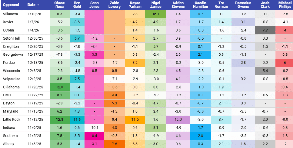 Needless to say, it looks like the freefall has ended, for now, and Marquette has stabilized around an AdjEM of 5. Again, that’s not something to be happy about in and of itself, but it sure beats the descent of the first 8 weeks.
