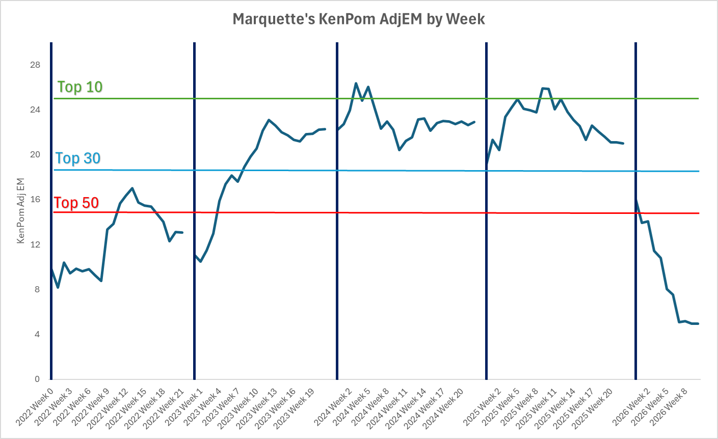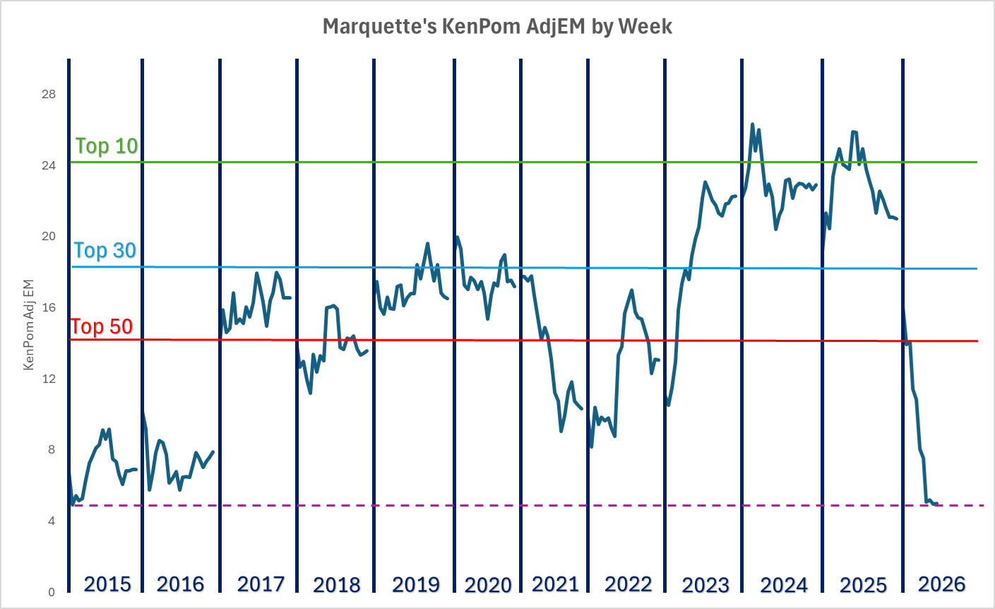 As of 1/12/26, this is currently the 3rd lowest point in recent Marquette history, only trailing the first week of the 2015 season, when it lost to Belmont, went to OT with IUPUI and was shellacked at home by Iowa and then last week. That low point was 4.91, and this team is sitting at 4.97.