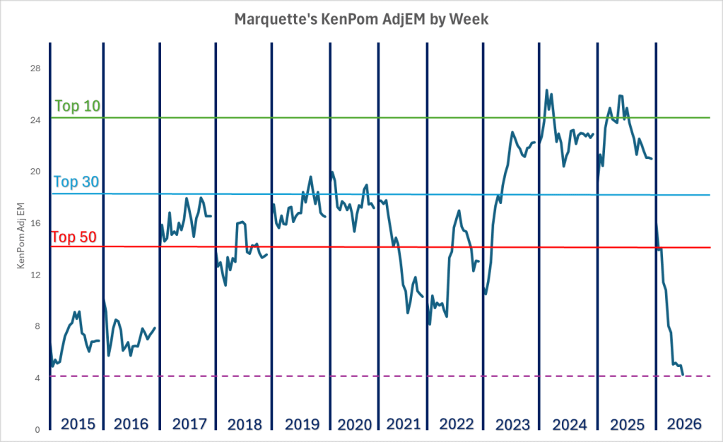 As of 1/19/26, this is currently the lowest point in recent Marquette history. That low point was 4.91, and this team is sitting at 4.28.