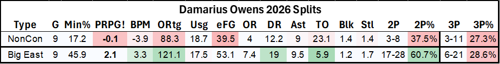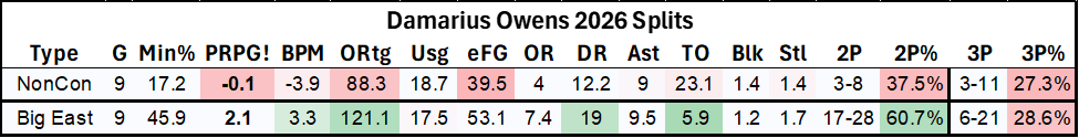 The fact Owens is playing in the final minute of the game is surprising in and of itself. Per CBB Analytics, he’s only played in clutch time in two games this season for 9 minutes total, this being one of the 2. But it shows the growth in his game more than any stats can. Shaka believes in him and the results are speaking loud and clear.