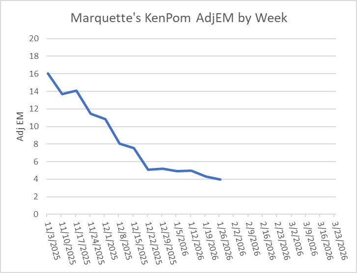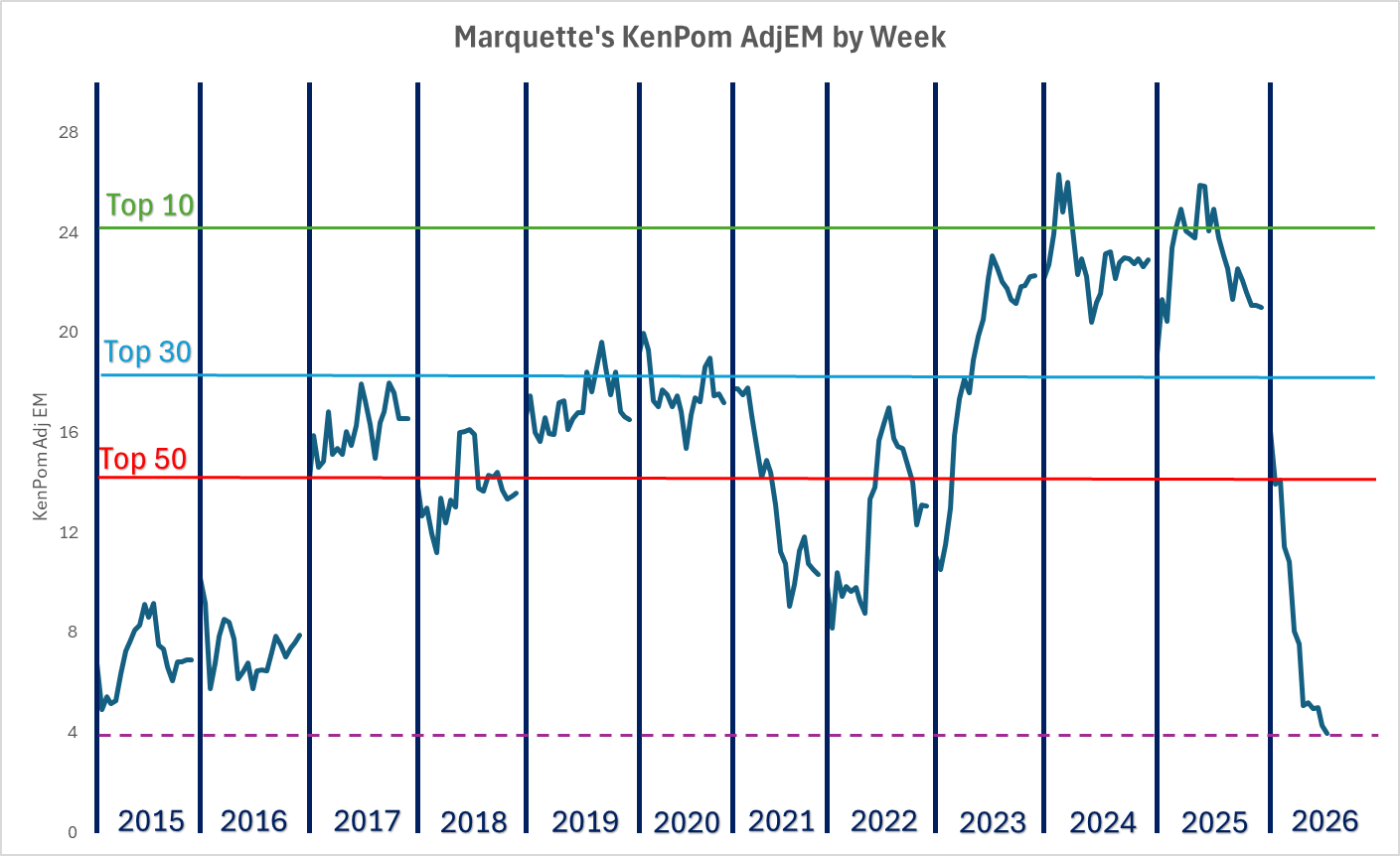 As of 1/26/26, this is currently the lowest point in recent Marquette history. That low point was 4.91, and this team is sitting at 3.95.