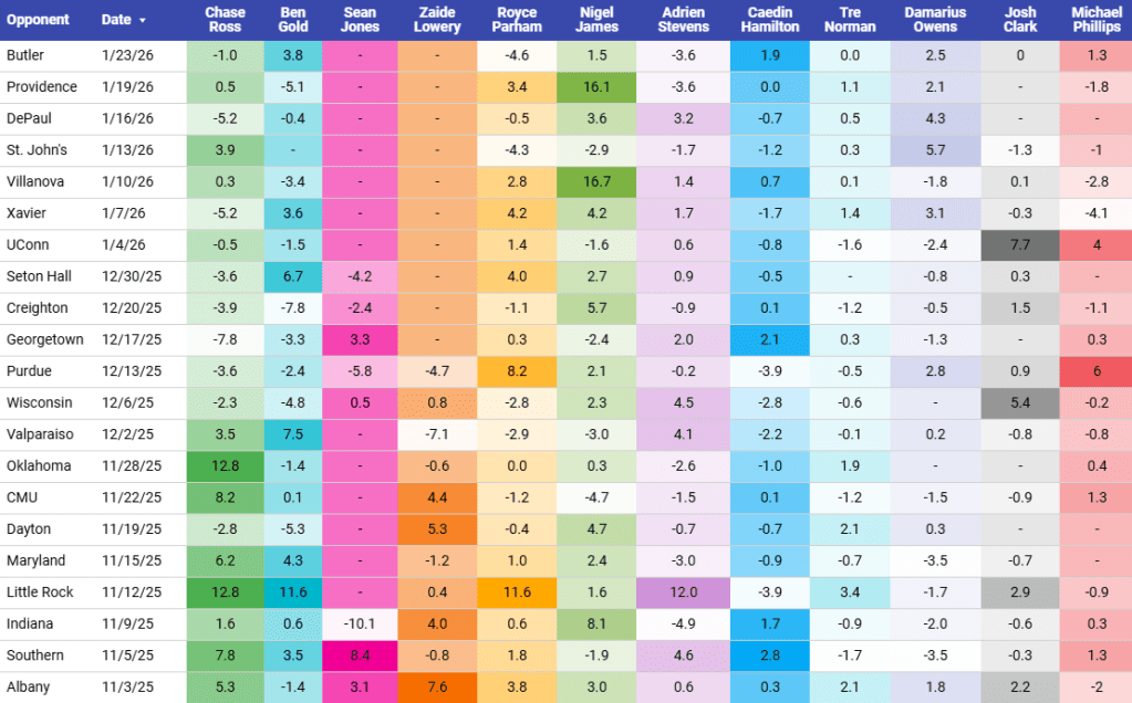 In an 11 point loss, you expect players that played big minutes to have pretty bad on/off splits, and MU’s top 3 sure did.