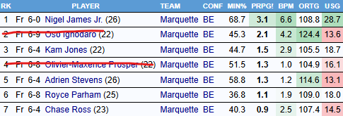 Similarly, while Marquette’s team offense has taken off the last few weeks, it had come at the expense of the defense. As Parham has averaged nearly 37 minutes per game in that stretch, it’s not unfair to say Marquette loses a bit on defense with Parham in. Advanced metrics like DBPR and DRAPM grade Parham as a barely above average defender, so not a negative per se, but his impact is felt primarily on the offensive end.
