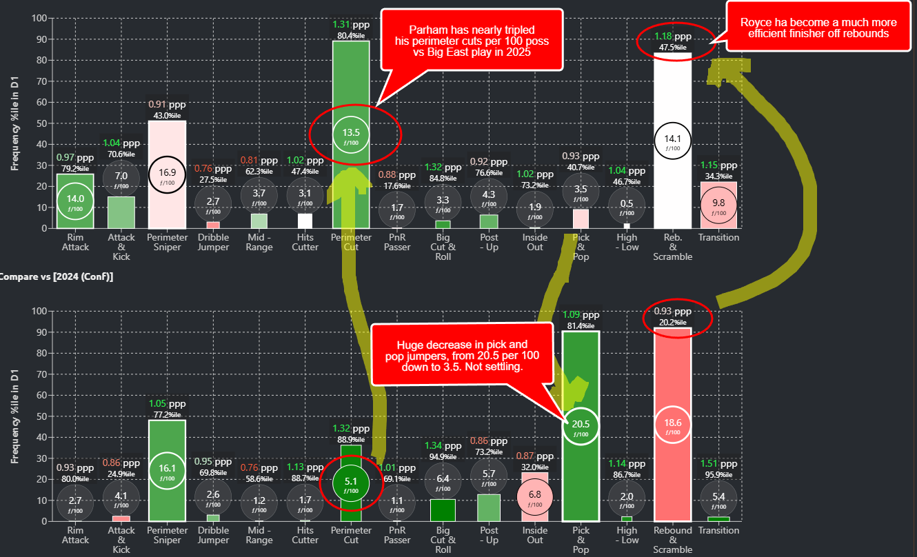 One last graphic. Here is how Hoop-Explorer categorizes offensive play types, with the taller a bar the more frequent it is used compared to D1 averages, the greener the more efficient, and the number per 100 possessions circled. Parham has basically traded pick and pop 3 for perimeter cuts compared to Big East play last season.