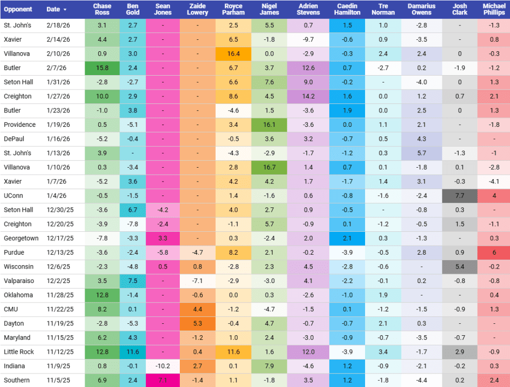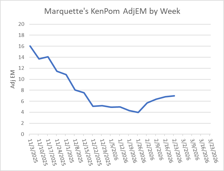 Marquette has only 1 game last week, that fit a fairly familiar pattern. It digs a bit of a hole, spends an exorbitant amount of energy climbing out of said hole, but ultimately runs out of gas for a “they didn’t play poorly loss.” And sure enough, despite a 76-70 loss to St. John’s at home in its sole contest, Marquette did see its Adj EM climb a tad, crossing the 7.0 mark for the first time since late December.
