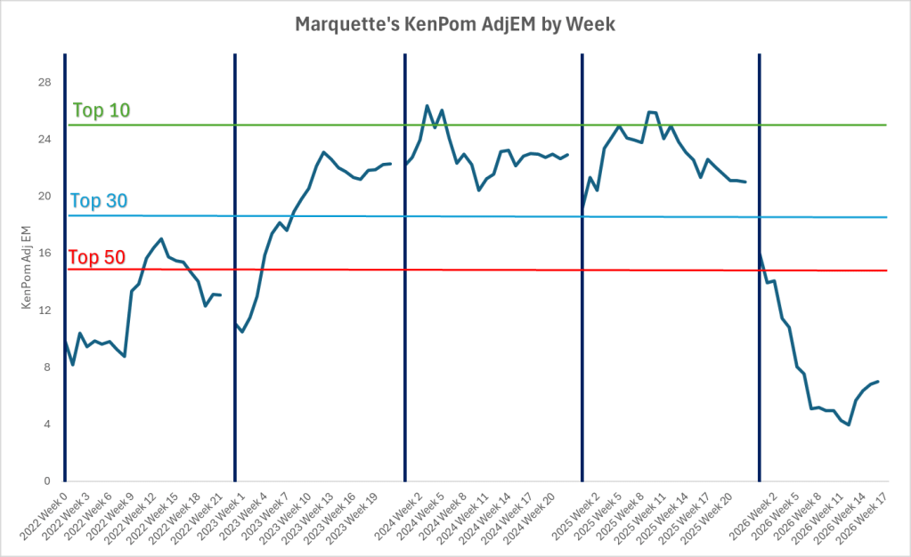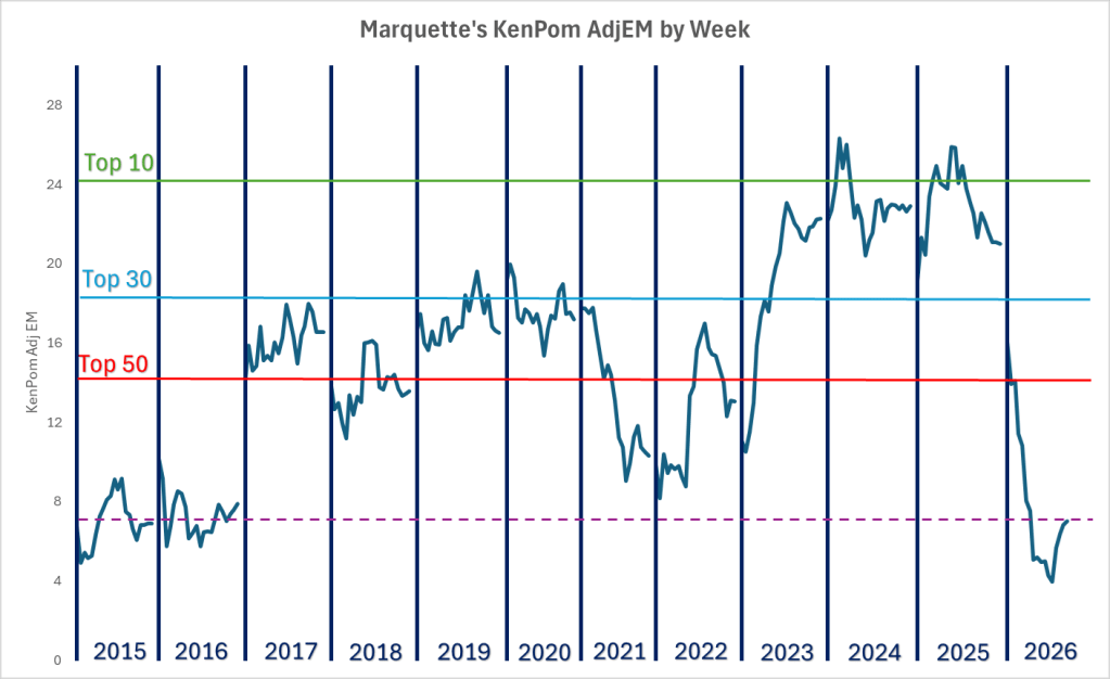 As of 2/23/26, Marquette is officially above the 2015 team, so not the worst in 20+ years.