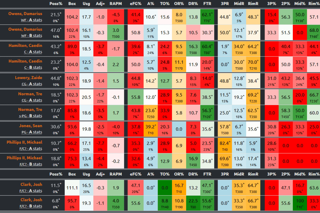 Below I’m going to paste a screenshot from Hoop-Explorer, which may be the most valuable free-tool I’ve ever come across, basketball or other wise. One of the features it has is allowing us to split the season into parts, and then see the individual changes in advanced metrics from players in that timeline while filtering out garbage time. The A row will represent 2025, the B row 2026.
