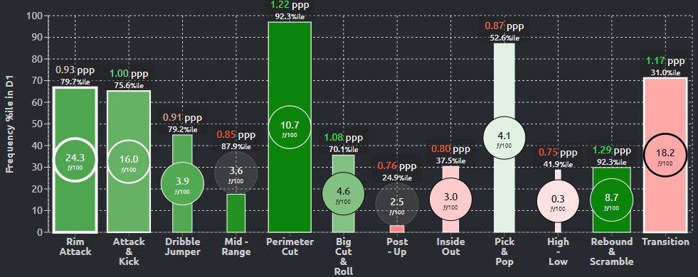 In 2025, transition opportunities (22.6), rim attacks (18.9) and drive &kick (15.0) were the 3 primary sources Marquette’s offense initiated plays. The height of the bar tells you how that volume compares nationally, while the color of the bar tells you how it compares in efficiency, compared to D1 for those play types. All that red confirms what you already know, MU was inefficient everywhere on offense.