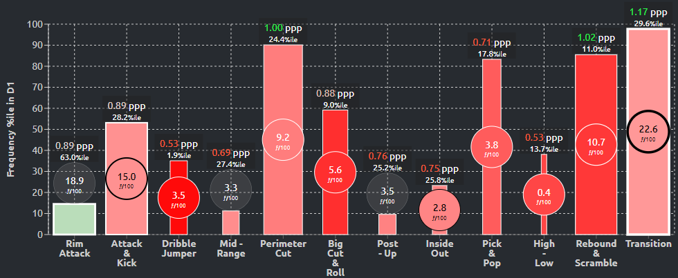 In 2025, transition opportunities (22.6), rim attacks (18.9) and drive &kick (15.0) were the 3 primary sources Marquette’s offense initiated plays. The height of the bar tells you how that volume compares nationally, while the color of the bar tells you how it compares in efficiency, compared to D1 for those play types. All that red confirms what you already know, MU was inefficient everywhere on offense.