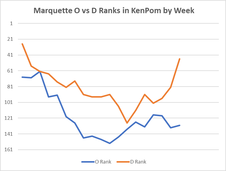 Of course, even though this is meant to highlight a given week’s ups and downs, I still want to throw some context in there. Here’s a look at how Marquette has graded out in KenPom each week of Shaka’s tenure.