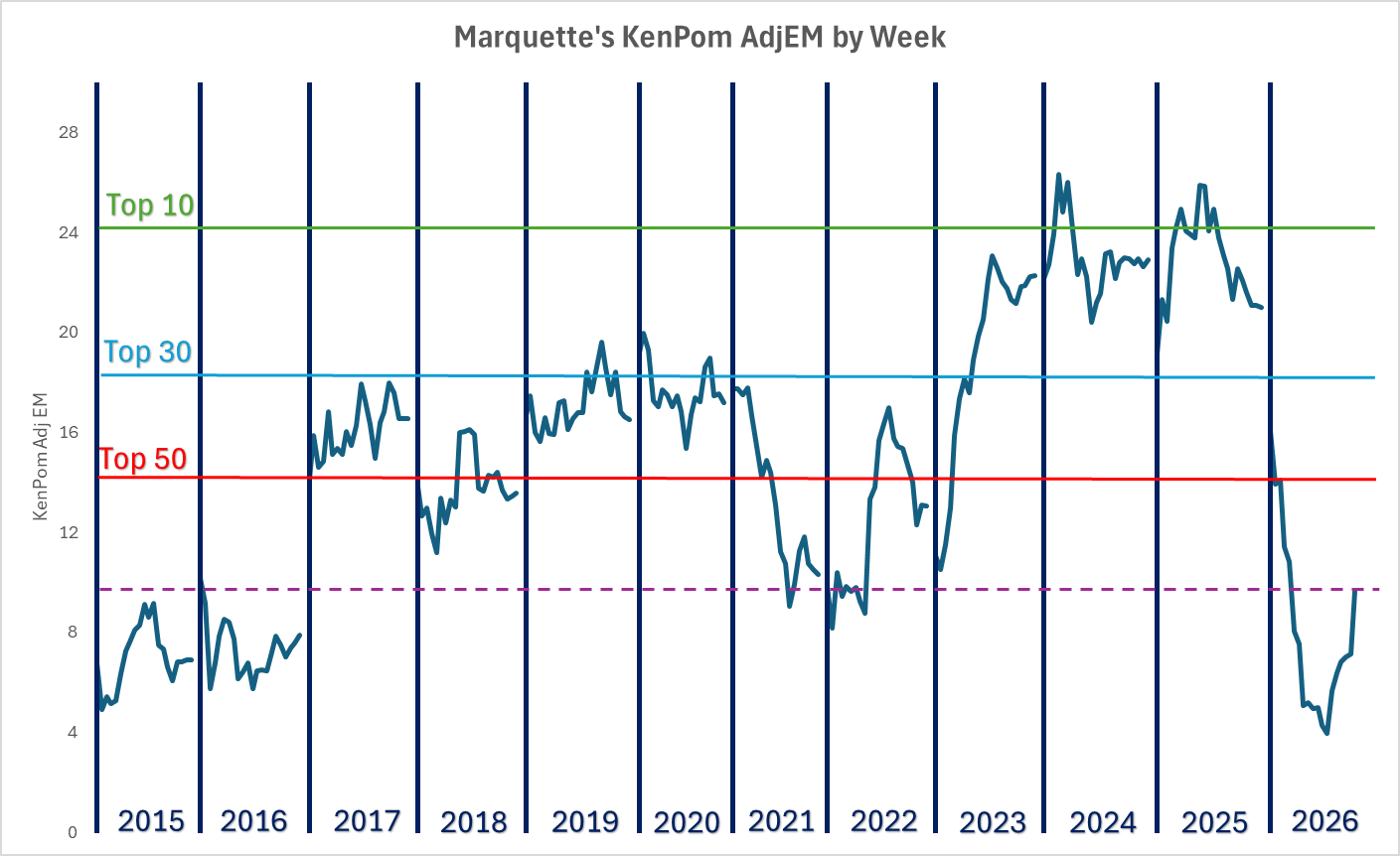 As of 3/9/26, Marquette is officially above both the 2015 and 2016 teams, so not the worst in 20+ years. I love the perspective this chart provides.