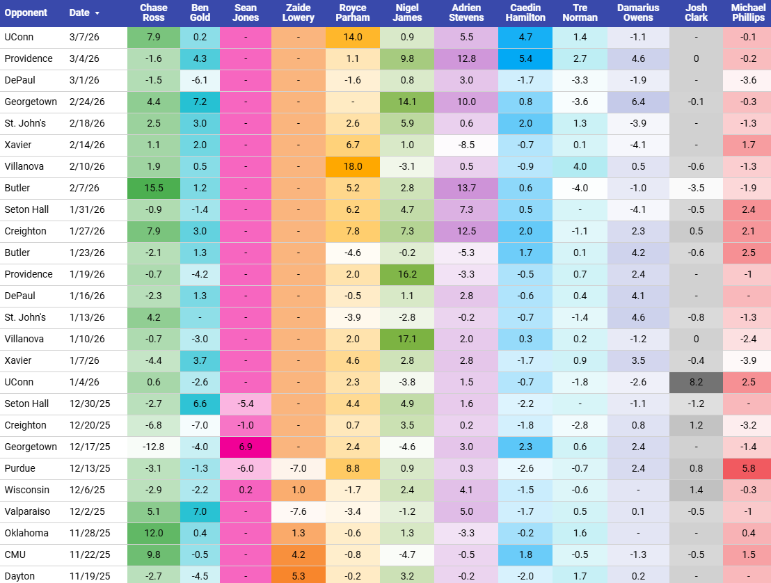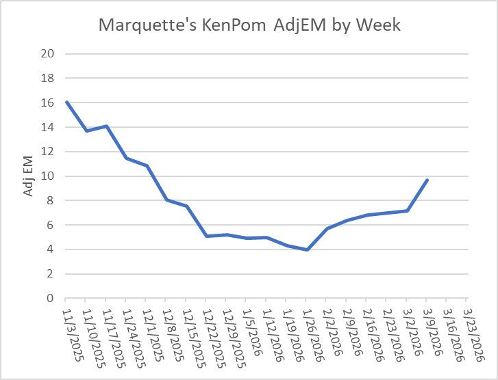 By KenPom’s AdjEM rating, Marquette improved 2.52 points just last week alone, which is unheard up for this late in the season, with 30 game’s worth of results already baked in. It’s the 3rd largest 1-week swing in the Shaka era, and the 5th largest since the 2014 season.