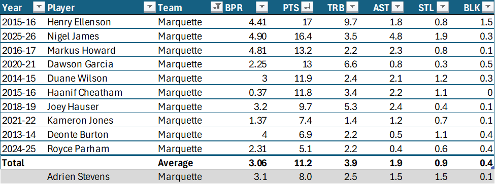 Looking at just past Marquette players, Stevens posted the 5th highest BPR since 2014, and the 2nd best under Shaka. Whether he got rewarded or not, there is no denying Adrien’s impressive campaign and bright future. He’s a key component of the exciting core MU has found the last 3 months with Nigel and Royce.