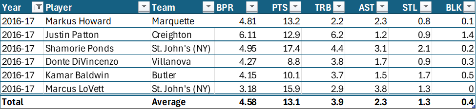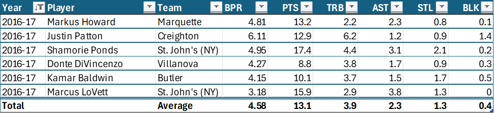 Ultimately, I think the fact the 2017 team has 6 players compared to only 5 this year has me leaning towards 2017, as does the fact 4 of those 6 were on top-35, NCAA tournament teams compared to only 2 this year.