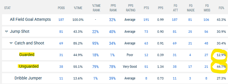 So that makes the type of 3s this team takes imperative. Per Synergy, MU is shooting 44.7% on unguarded spotup 3s, and only 12.9% on guarded ones. While it makes perfect sense teams will be better at open shots than unopen shots, this disparity is almost unheard of. In fact, MU is the worst team in the country (through 8 days) at hitting guarded spot ups.